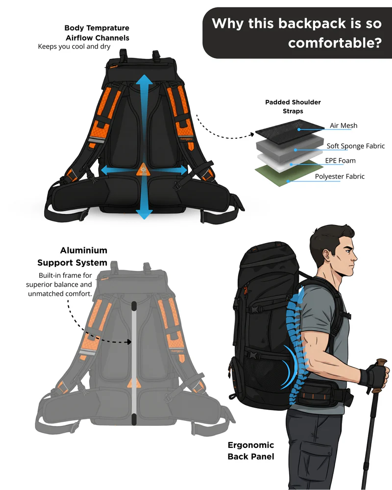With airflow padding, ergonomic straps, and a strong back frame β€” this bag is built for long hours of carrying without fatigue.